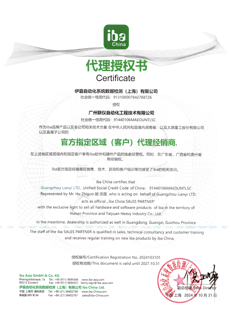作为iba中国内官方销售合作伙伴和优秀的工程技术公司,在湖南省和太原重工有限公司区域内独家销售iba的所有硬件和软件产品,同时在广东省、广西省、山西省、陕西省、贵州省也获得授权。